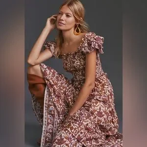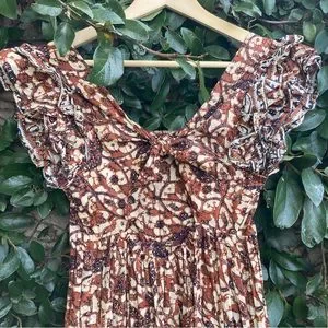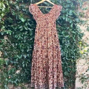 This is the “Bouquet Smocked Maxi Dress” by Love the Label in boho floral Mabel Khaki brown motif colorway, size extra small, like new condition.