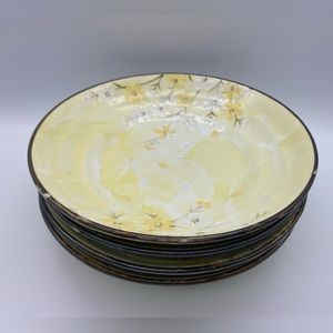 Lot of 4, unmarked ceramic, embossed floral japanese yellow & white cherry blossom design with brown trim, EUC, no chips or cracks, each measure approximately 9in diameter & 2in tall, please see pictures