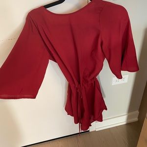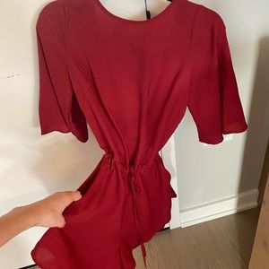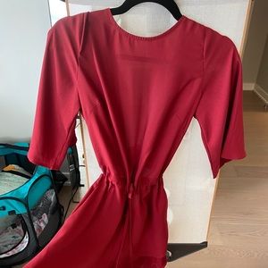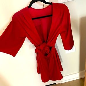 Red flowy romper with pockets. Open back ties in front and back. Great for Valentine’s Day! Classy and sexy. Too big on me I’m 5’5 110 pounds.