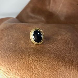 Rafael Alfandary brass Brutalists cabochon black glass. Rafael is a very collectible jewelry designer whose pieces were worn by many celebrities. His works had a raw handmade quality to them. ring face measures measures 1.25” L x 0.75” W.