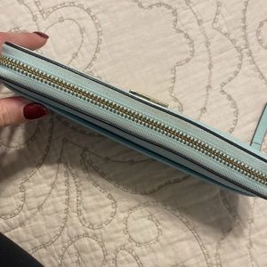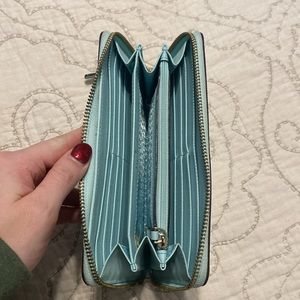 Gently used, some spots from normal wear and tear being in my purse. Great size.