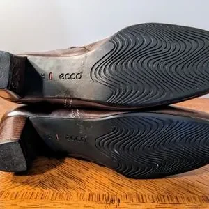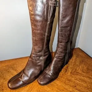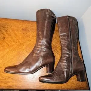 These ECCO, knee- high boots are made of a soft leather with a 2 inch, block heel. They feature a zipper that is working perfectly and a stylish buckle. They have been gently worn, please see the pictures to verify the condition of these boots.