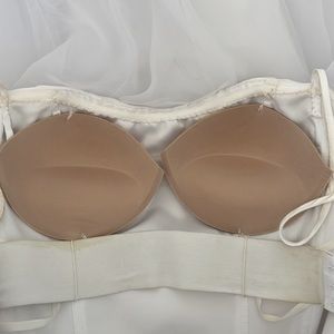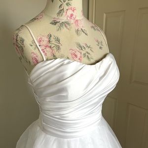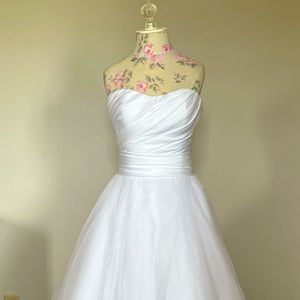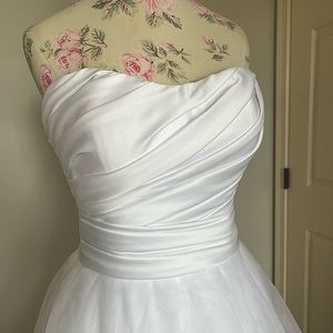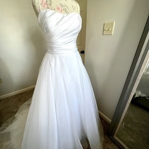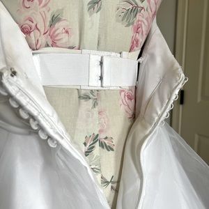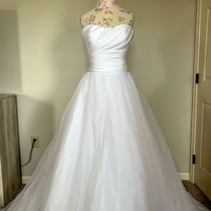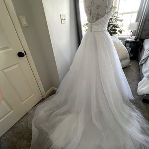 wedding dress from Disney fairytale wedding! Dress has been altered extremely well..there is a built in bra/cups and elastic band around torso (to keep dress up snug), custom straps (can be used with or without) along with a multi-point bustle. Could use to be professionally dress cleaned (there is some makeup on inner cleavage area, a few small stains on layers, bottom has graced floor). Overall, good condition and lots of life left for someone’s special day! Orig price $3900 with $1200 in alterations. Open to offers and questions. The dress was originally purchased size 8 but has been fitted more for a size 6 woman.
