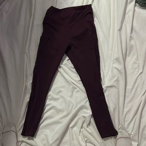 Maroon Fabletics leggings with mesh pockets.