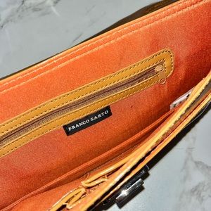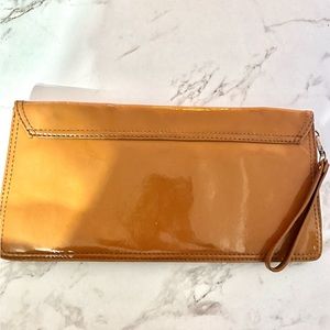 Tan Franco Sarto Clutch. It has a beautiful glossy finish. Wristlet is detachable.