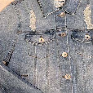 Super soft distressed denim jacket in excellent condition! Denim is not heavy and stiff at all, has stretch and is light weight. Beautiful light blue tone with silver hardware. Hits at waist. Your perfect go-to jacket!