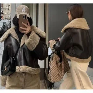 Faux leather biker jacket with contrast faux shearling lining. Wide adjustable lapel collar with strap. Long cuffed sleeves. Front pockets. Adjustable tabs at hem.