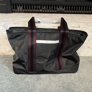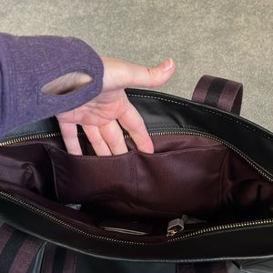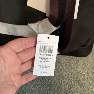 NWT, beautiful Coach Ellis Tote Bag. Perfect daily or travel bag. Straps are a great length that allow it to be carried as a shoulder bag or extended as a tote. They are a multi, black and maroon/purple color. The bag is large enough to store your everyday or overnight essentials as a tote, yet small and lightweight enough to carry as a purse itself. Full zipper to secure your things, with two inner slip pockets, and a larger zipped inner pocket. My favorite are the 2 external slip pocket. front and back, that are a perfect fit for smart phones, envelopes, etc. This was a duplicate gift, so has never been used and has been stored with original packaging to protect the bag and the hardware.