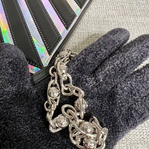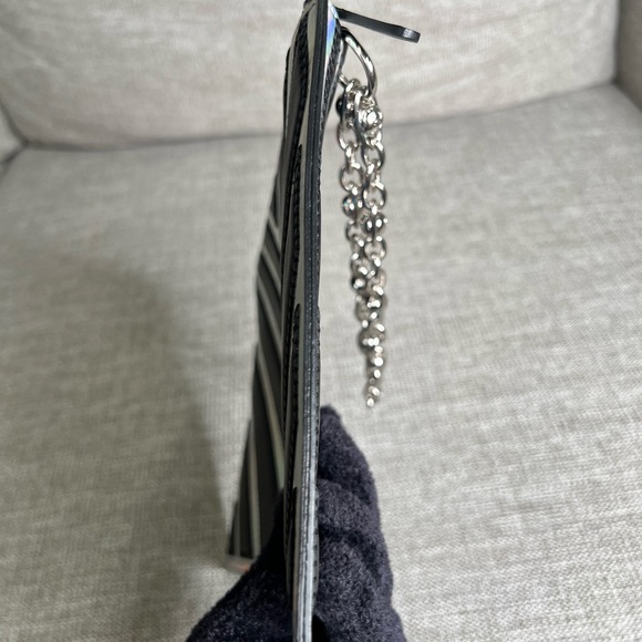 Hard to find Chanel chevron pvc pouch/wristlet in very good condition, gently used. Lambskin leather in very good condition no cracks or rip. PVC in very good condition with minor scratches. Silver wristlet chain in very good condition with scratches. Serial number is intact. PVC looks like a rainbow color but it is metallic silver,rainbow color is just a reflection from the lighting.