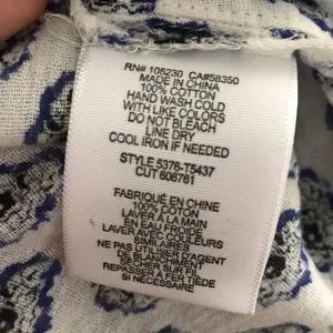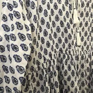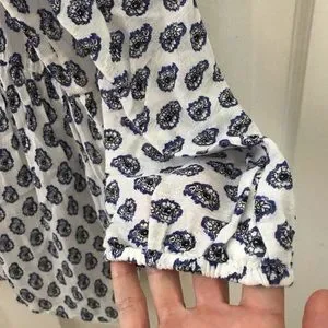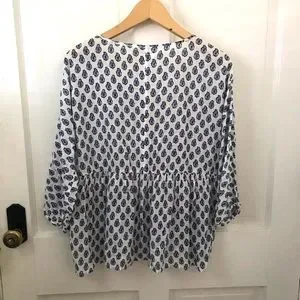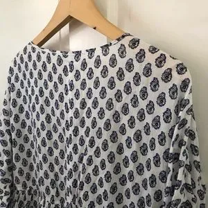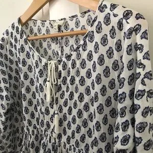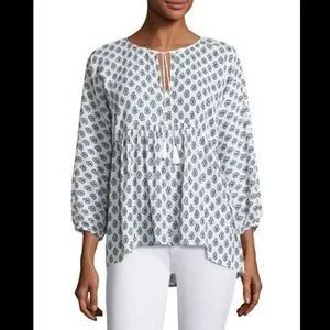 Beautiful lightweight cotton blouse with blue and black paisley-like print, keyhole tie front with tassels, elastic wristband, 3/4 sleeves, FLAW: there is an approximate 3–4” horizontal misprint/snag on front right chest. Please see all pictures. Price reflects!