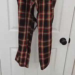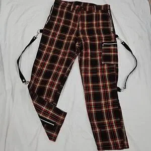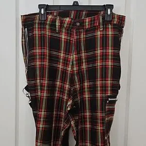 Vintage Y2K / 1990s Plaid Bondage pants by brand DOGPILE. They resemble pants worn by singer Gwen Stefani of No Doubt. These rare black, red, and yellow plaid pants are in excellent used condition for their age. I am the original owner and purchased them back in the late 1990s. They feature 5 zippered pockets and additional non-functional "pockets" with working zippers on the back lower legs. Also comes with 2 original, adjustable straps in the back that can be changed from being clipped parallel (i.e., 1 strap hooked to the lower and upper part of the same pant leg) or being hooked criss-cross (i.e. one clip / hook is attached one upper pant leg, while the other is clipped to the opposite lower pant leg).