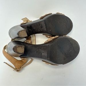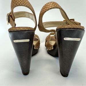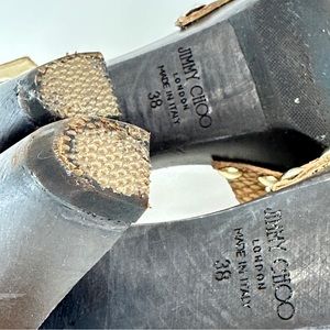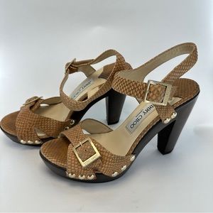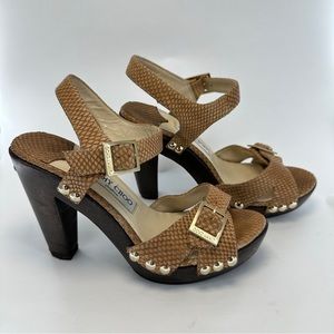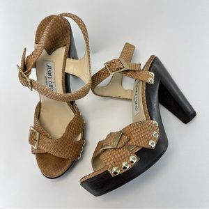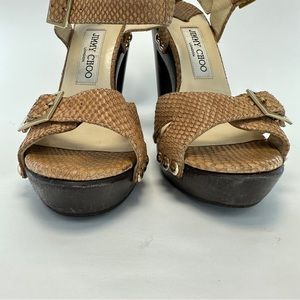 JIMMY CHOO Leather Snake Embossed Tan and Brown Wood High Heels. Size 38, US 8. Gold hardware. Buckled Toe strap and ankle strap. 4” heel height. Good used condition. Refurbished by a professional cobbler, new heels.