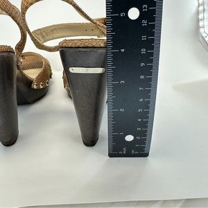 JIMMY CHOO Leather Snake Embossed Tan and Brown Wood High Heels. Size 38 US 8