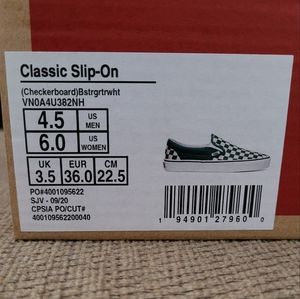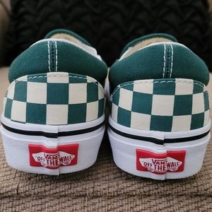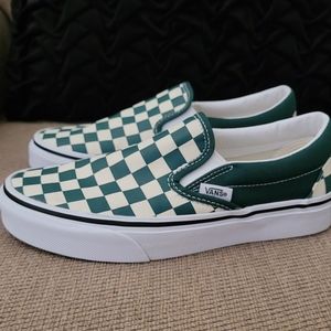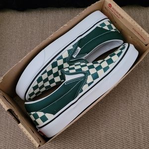 Vans unisex classic slip on green checkerboard sneakers. Stamped size 6 women. Stamped size 4.5 men. Excellent pre owned condition. In original damaged box. Please see all photos which were taken in natural light.
