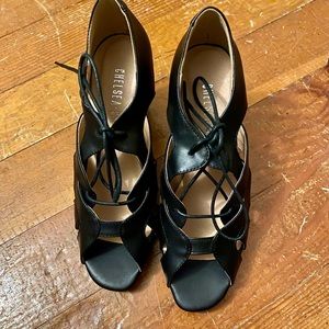 Chelsea Crew Women's Forthcoming Confidence Cutout Heels. With interwoven arches forming their sleek cutouts, sleek laces, and leather linings, this courageous pair makes putting your best foot forward a recurring affair. Man-made upper and sole. Leather lining. Lace closure. Heel measures 3 inches. Never worn.