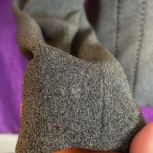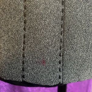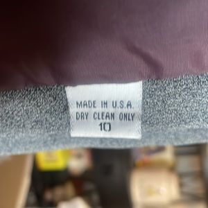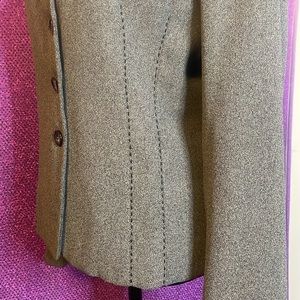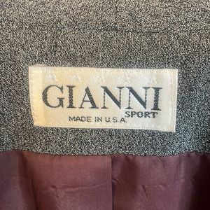 Pre-owned Gianni Sport women's gray tweed blazer jacket, size 10. This classic blazer features a stylish textured wool blend fabric and built-in shoulder pads for a structured silhouette. It has a two-button closure and a collared neckline. There are two minor spots as shown in the photos. Perfect for office wear or a chic casual look.