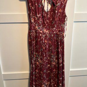 Short, maroon, floral dress. Dress closes with a drawstring top showing a semi open back. Dress falls to right above knees. Dress has never been worn and contains original tags.