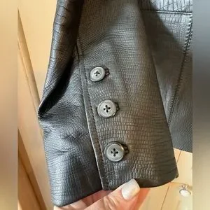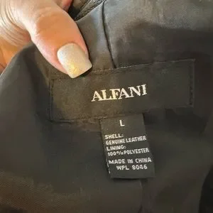 Black leather blazer by Alfani. Size L. 4 button front, 3 button cuff, 2 hidden pockets, fully lined. 26 1/2” long, 24” sleeve, 19” armpit to armpit when buttoned. Excellent used condition.