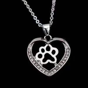 Beautiful silver toned heart necklace with paw print in the center. The heart has simulated diamonds along it. Great way to keep your pet close throughout the day.