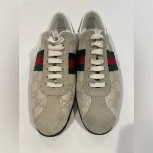 Classic Gucci w/traditional red and green stripes on the side with suede and embossed monogrammed GG leather upper.