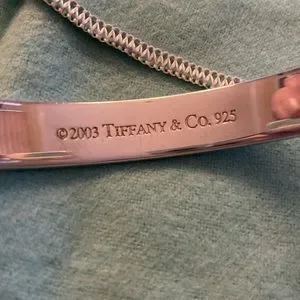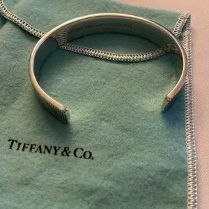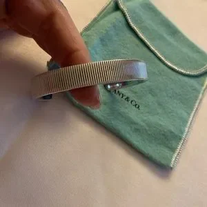Tiffany & Co. Sterling silver coin edge narrow bracelet 2003. It measures 6 1/4” with a 1 1/2” opening. Recommend for a larger wrist. Great condition. Tiffany pouch included.