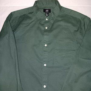 Size Medium Men's 100% Cotton H&M Green color, long-sleeve BUTTON DOWN SHIRT with One Functional front pocket ( Gently Used PRE OWNED CONDITION Also has Extra Buttons)