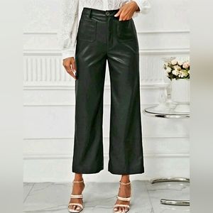 Purchased from SHEIN, these cropped wide leg leather pants are so in! Stylish fall essential guaranteed to stun, they snatch the waist and flatters any shape. Buttons at top with zipper fly and two cute pockets in front give them that extra "umph." Non-stretch/fits true to size but slightly loose for comfort. Style them casually, for a party or even look super chic at work! Size XL/12. Lightly worn/No flaws