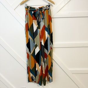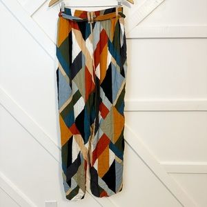 Multicolor geometric printed gauze high waisted tie waist wide leg pants.
