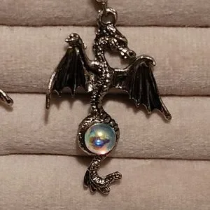 Silver tone dragon earrings with pearl-like stone.