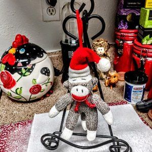 This a cute little Santa Sock Monkey that you can add to your tree or he would look cute sitting in a wreath with poinsettias and tiny sparkling lights. I've seen the larger sock monkeys but never one this small which makes him that much cuter. . He is approximately 7.5" tall and 4" wide.