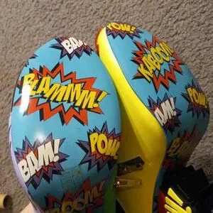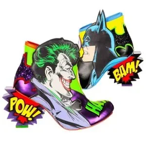 These mismatched high heel boots feature everyone's favourite arch enemies, Batman and The Joker! Each foot is dedicated to one character, with graphic appliques of Batman and The Joker and their opposing colours, sat atop comic book style BAM! POW! concept heels. These beautiful zip up boots are a must for any fan of Batman and The Joker!