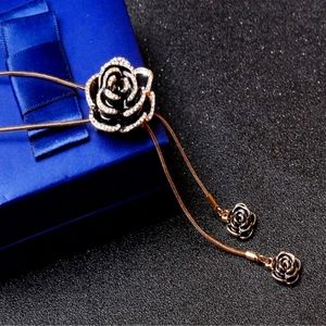 Long necklace for women trendy:Sweater necklace with rhinestones and black polished rose flower charms to match your sweater, bottoming shirt, dress, and other outfits.