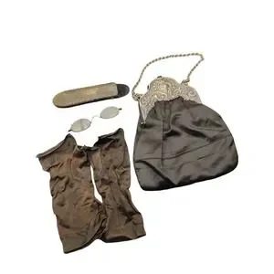 Antique Gorham Silver Black Purse w/ Antique Glasses and Gloves inside