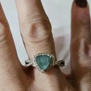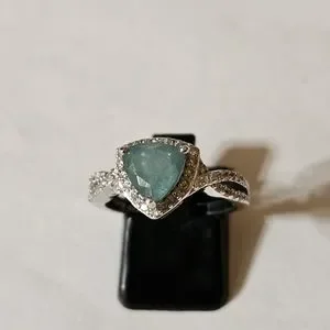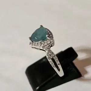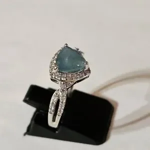 Stunning genuine grandidierite with the perfect shade of blue & green. The setting is sterling silver with platinum overlay. The main stone is surrounded by genuine diamonds. Size 8. Stamped D'Joy 925!