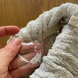 Height: 13cm Width: 22cm Depth: 4cm. Strap drop: 20cm. Detachable strap. Top zip closure. Embellished with beads. All over pattern placement may vary