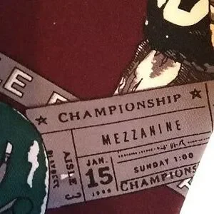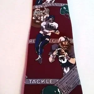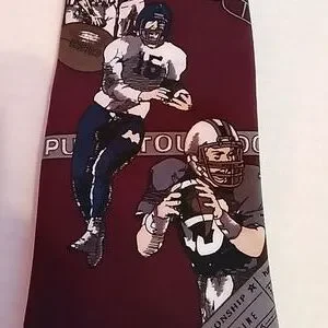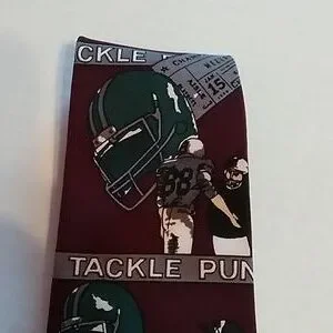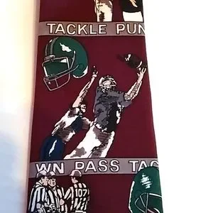 This is used but in good condition. It is by American Sports and shows football players and referees .Wine background with grey word bars across.
