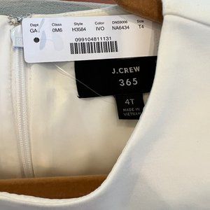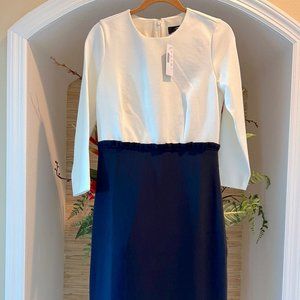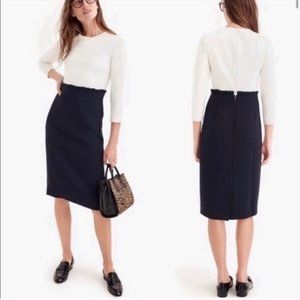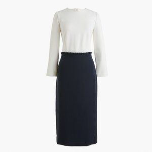 New with tags, never worn J.Crew Combo Dress in size 4T (tall). The dress combines a ivory top with navy skirt giving the illusion of a perfectly tucked blouse and pencil skirt. Very chic and comfortable for post-pandemic office wear. Fits true to size for J. Crew IMO.