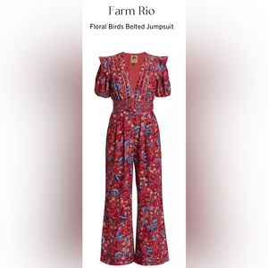 NWT Farm Rio's floral jumpsuit flaunts an eye-catching floral bird print and wide-leg silhouette. Short puff sleeves and a tonal buckled waist complete the look.
