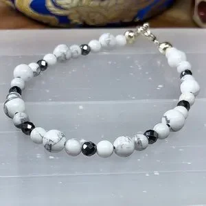 NOT part of 3/$25. 4mm and 6mm alternating natural howlite and hematite faceted beads with a sterling silver circle and bar clasp closure. 7.5”