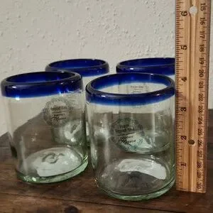 Set of 4 blue rimmed glasses handcrafted in Mexico. Size varies slightly due to the handmade nature of the glasses. Offers welcome!