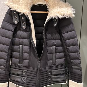 Black women’s puffer style jacket with leather straps with fur cuffs and fur collar. Fitted. Size small. Smoke free home.