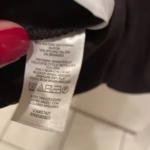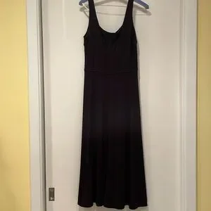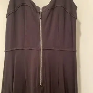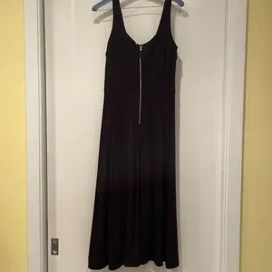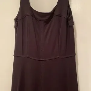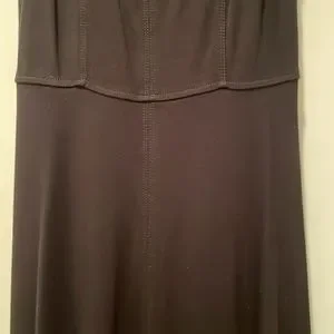 Only worn a nice and dry cleaned. This tea-length dress is a thick jersey knit and looks great alone, under a jacket, or over a tight fitting top (jumper style). There is some stretch and the back zipper adds a bit of flair!