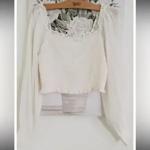 Aerie Square Neck Smocked Long Sleeve Crop Blouse White