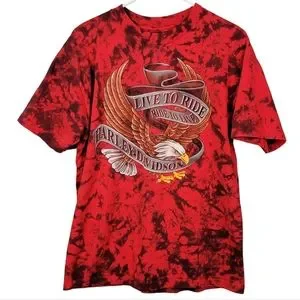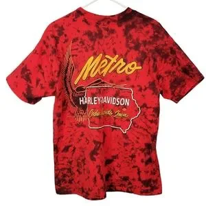 Very cool vintage Red and black Harley-Davidson Tye Dye. The Harley tees are almost always black so finding one that's so vibrant colored is neat. Bold front screaming eagle and a back hit from Cedar Rapids Iowa. This tee was purchased along with many others from a husband and wife that traveled the country on their Harleys over the decades, collecting shirts at shops as they went. This is one of those prized tees.