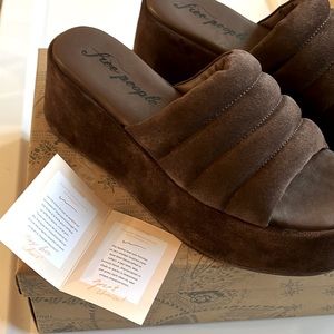 Free People Almost Paradise Platform Sandal in Sunbaked Brown Suede size 38, will fit 7 1/2 or 8. New In Box! Boho Fun Vibes! Beautiful dark brown color like Chocolate! Retail $129. See photos for best description. Nonsmoking home.