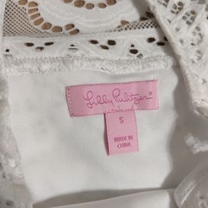Excellent condition! Lilly Pulitzer women's Lyra Dress in Resort White, size small. Beautiful! Great dress for an upcoming wedding or engagement activity. It is covered in lace and in lined underneath. It has a cold shoulder type sleeve. The fabric is comfortable and slightly stretchy. Measurements are shown in the photos. It comes from a smoke and pet free home. Only defect found upon final inspection was a few fuzz areas from the fabric getting rubbed onto something (see photos where I point this out). These fuzz areas can be trimmed off though. Other than that, the dress is in like new condition. All sales are final, no returns or refunds. Message me if you have any questions. Enjoy!