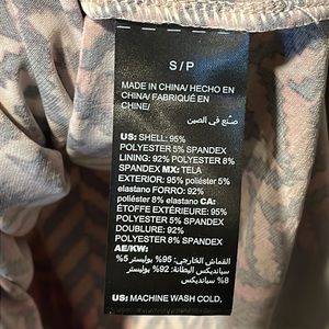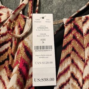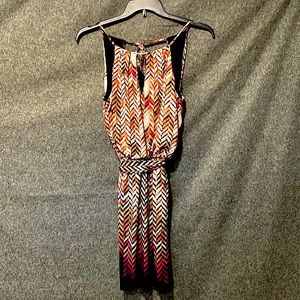 White House Black Market pink, black, white, and shimmery gold chevron patterned dress. Women’s Small. Halter neckline with keyhole in front and back. Ties in back at neck, ends have small gold beads, in front there is a small thin decorative gold bead on the keyhole.