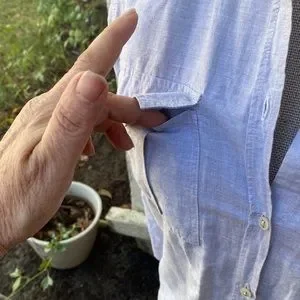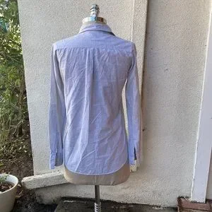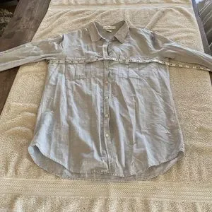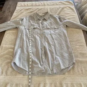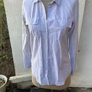 BD Baggies linen/cotton blend luxury Italian brand light grey thin button down blouse from Bloomingdale’s. Made in Turkey. So flattering on. Beautiful color grey and material. Looks great with pants or a skirt. First pix is a stock photo of a different print and color just to show how this lovely brand looks on. Mine is a gorgeous light grey color with two front pockets.