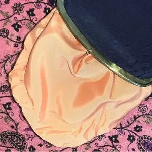 Vintage Elegant Handbag. Midnight Blue with Gold toned hardware. Mid Century Modern amazing small clamshell handbag with attached kiss lock coin purse, dark blue material exterior and strap, peach colored interior and coin purse, no brand name but there is a “WP” on the hardware screws. Excellent vintage condition, some slight hard to see wear at seams and some discoloration on the interior lining, see pictures for details and wear.