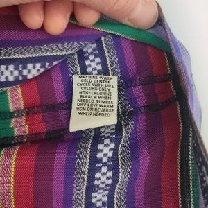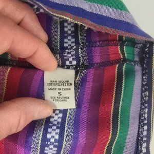 Style and Materials: Tapestry style mini skirt. Zip Closure. Polyester. Hand wash. Aztec Tribal stripes pattern. Multicolors. Bohemian. Artsy. Southwestern.